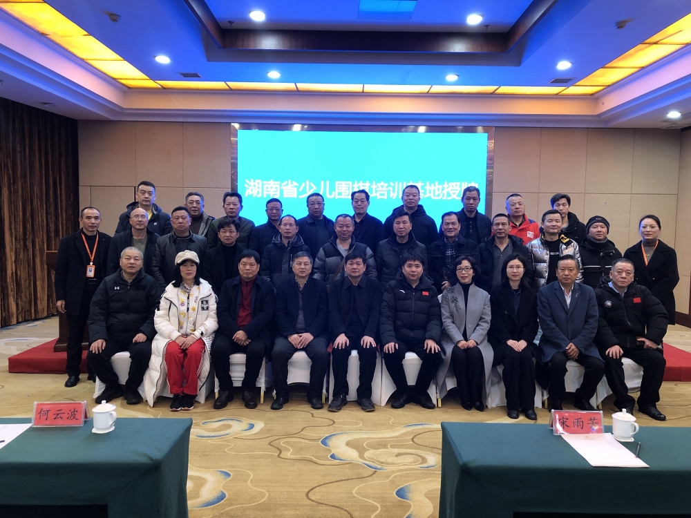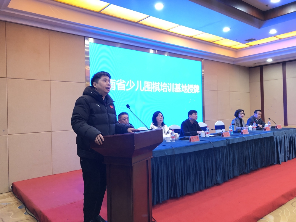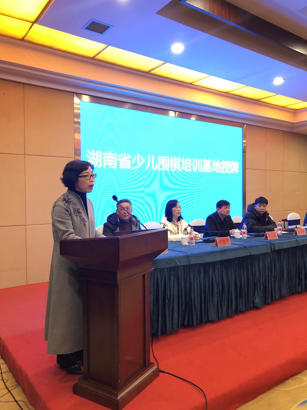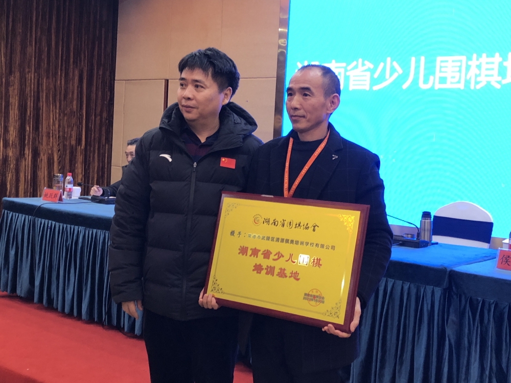 湖南省圍棋協(xié)會常務副主席兼秘書長杜亞捷先生授“湖南省少兒圍棋培訓基地”牌,常德清源棋院熊循先生接牌。